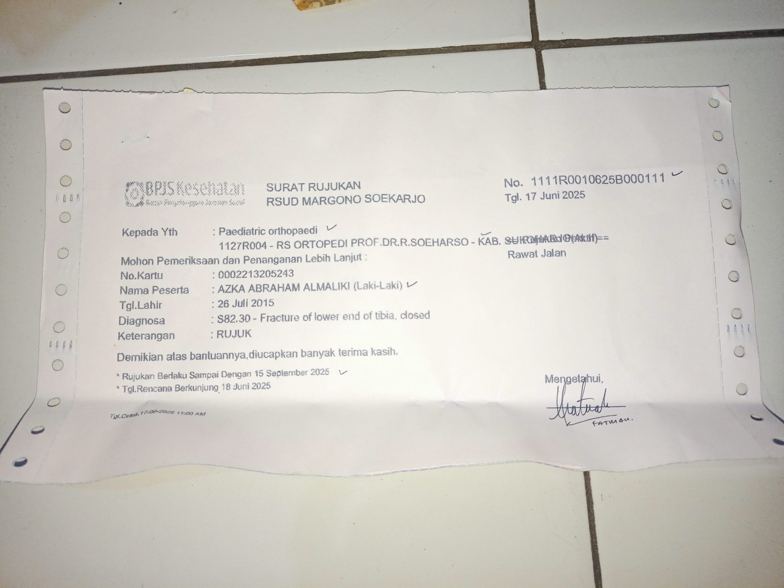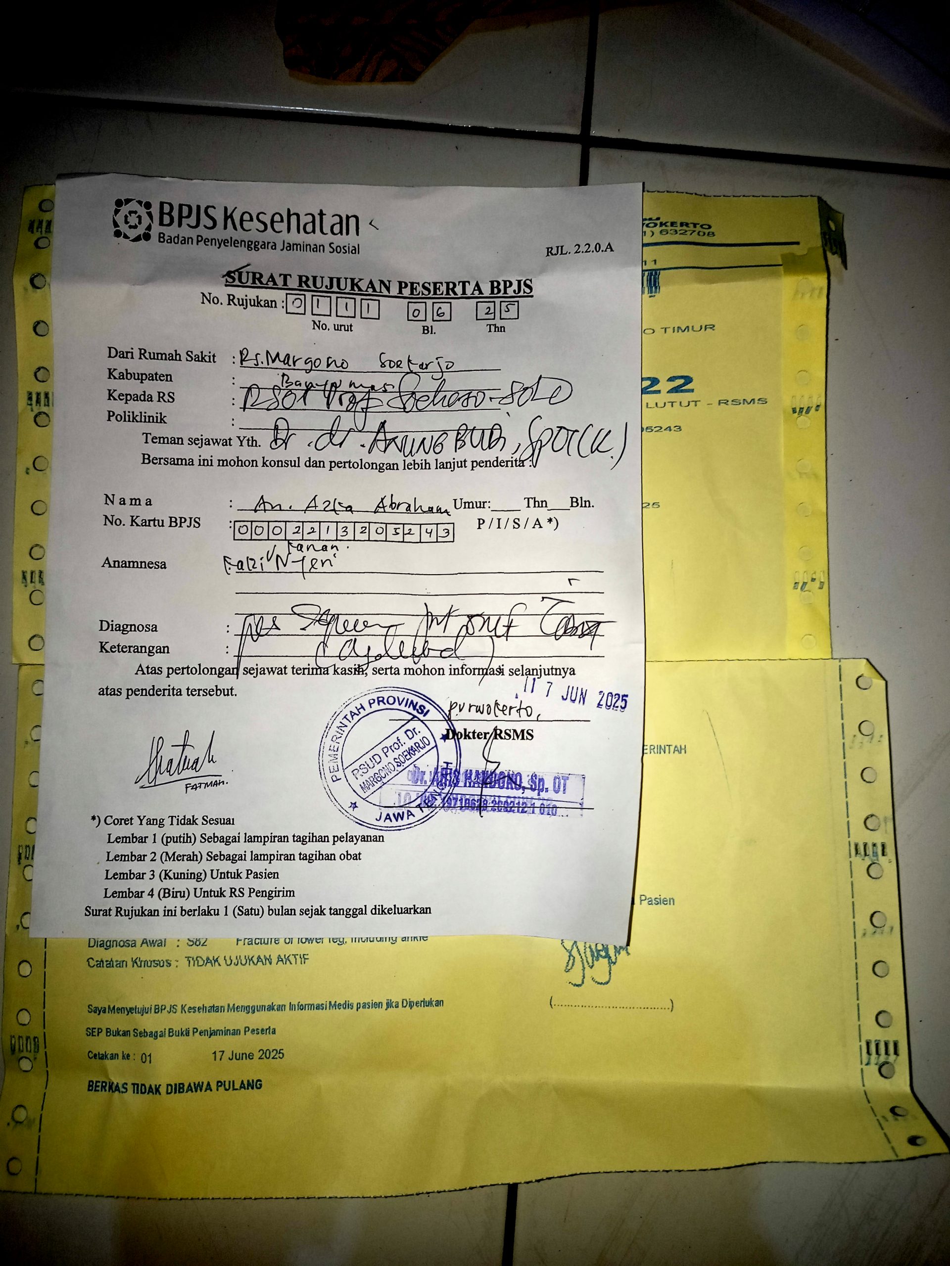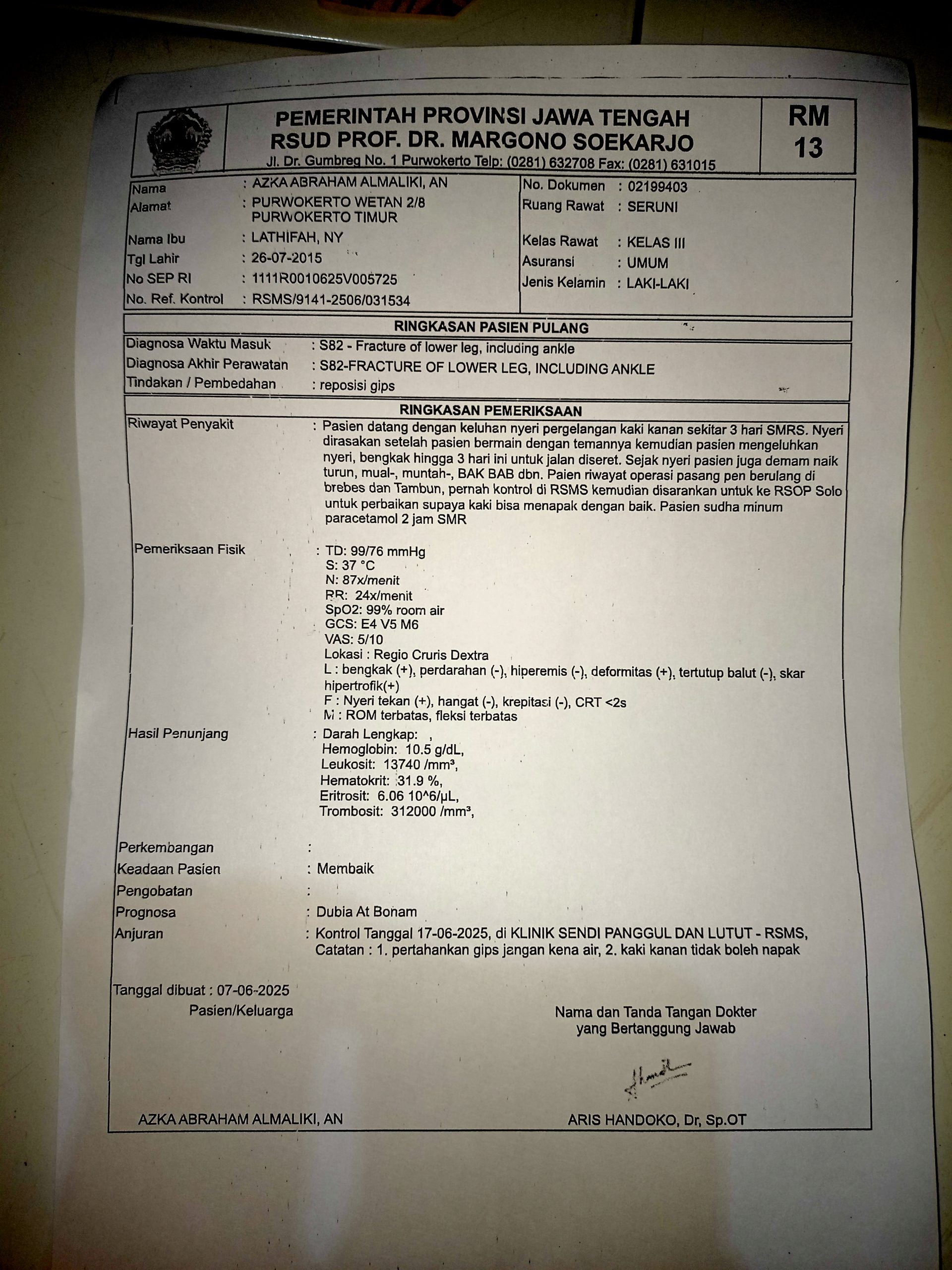 Namun, beberapa waktu lalu, setelah bermain, kakinya mengalami gangguan lagi. Kondisi Azka semakin memburuk dan membutuhkan penanganan medis yang lebih serius. Dokter menyarankan agar Azka dirujuk ke RS Solo(RUMAH SAKIT ORTOPEDI PROF.DR.R.SOEHAERSO)untuk menjalani operasi besar agar kakinya bisa sembuh pulih sepenuhnya.